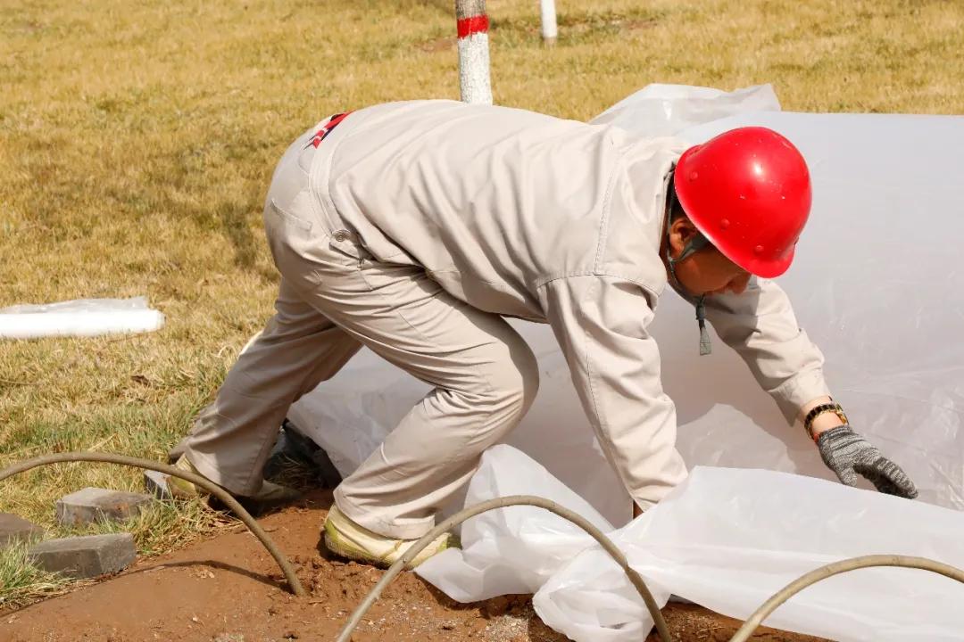 綠化帶內(nèi)工人師傅們默契配合,撒種、扶苗、培土,一氣呵成,并利用塑料薄膜支起了一座座“小拱棚”,盡管泥土沾身,但從他們臉上看到的是對未來的美好憧憬。