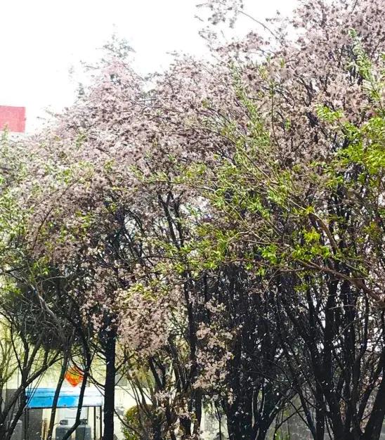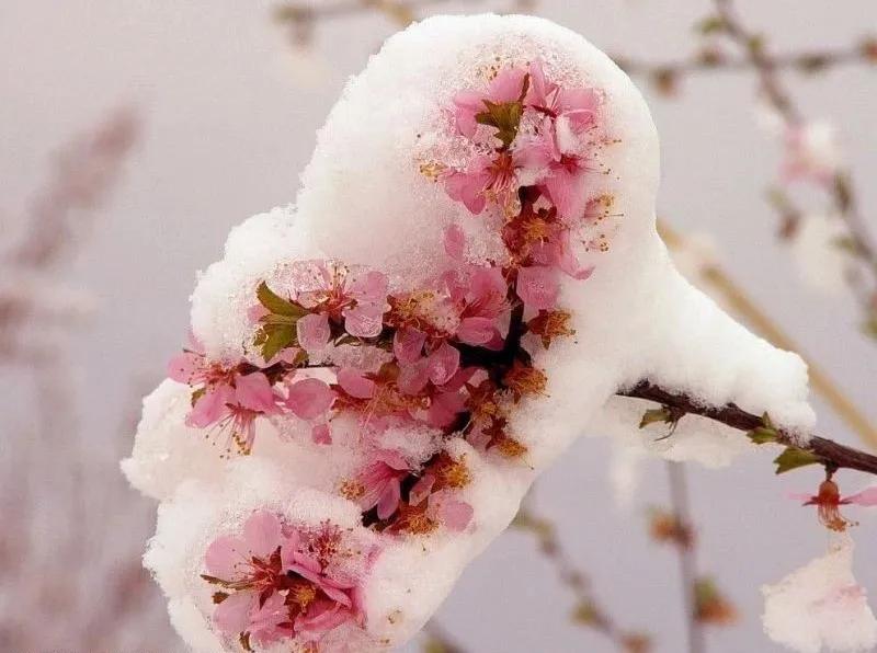 抬頭望向遠(yuǎn)處,那剛開不久的桃花樹上也落滿了潔白的雪花,雪花把整個(gè)桃樹都包裹了起來,就起名叫“雪樹”吧。套用盧梅坡的《雪梅》,也許可以說“桃須遜雪三分白,雪卻輸桃一段香”。在春天這個(gè)百花園里,各種花都在競相展示自己的艷麗,也許雪花也想來湊熱鬧呢!