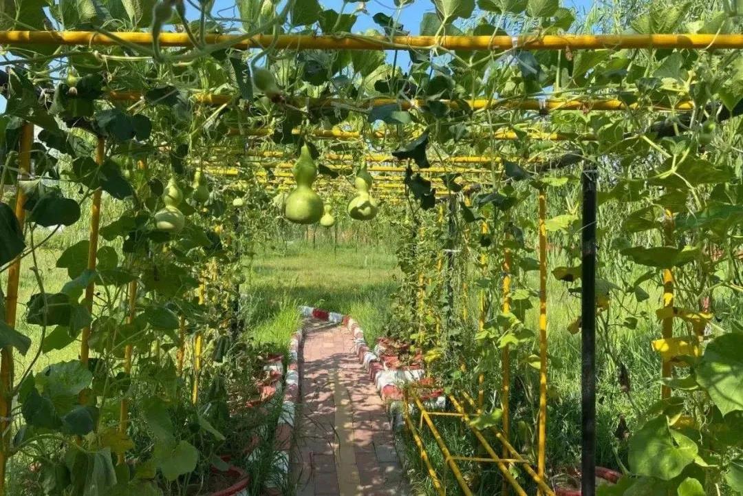 向日葵花旁是一條蜿蜒的小路,徜徉于小路上,便會看到葫蘆藤蔓已爬滿架,在綠葉的襯托下煞是好看。小路盡頭是一大塊寬敞開闊的健身場地,那是員工們強身健體的好去處。