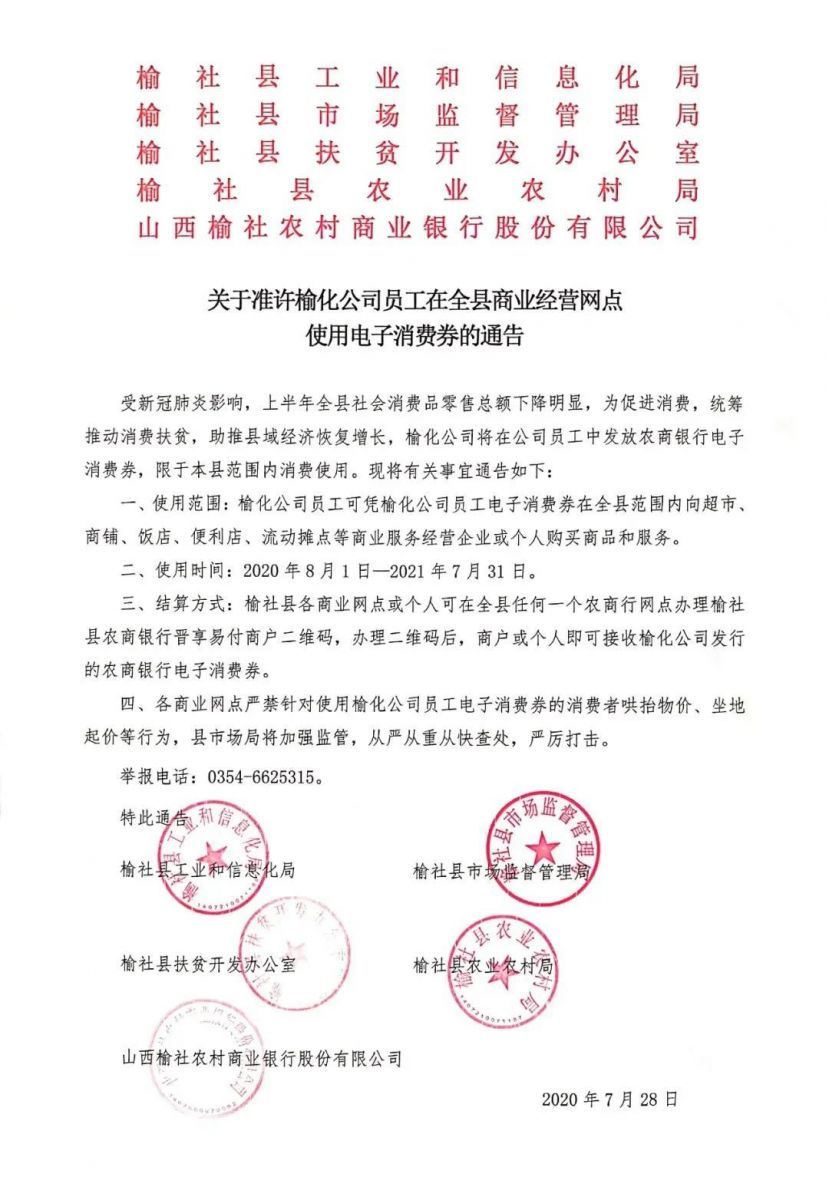 7月26日,榆化電子消費(fèi)券率先通過52名在崗年薪制干部進(jìn)行試用;8月18日,榆化電子消費(fèi)券正式進(jìn)入榆社市場(chǎng)。