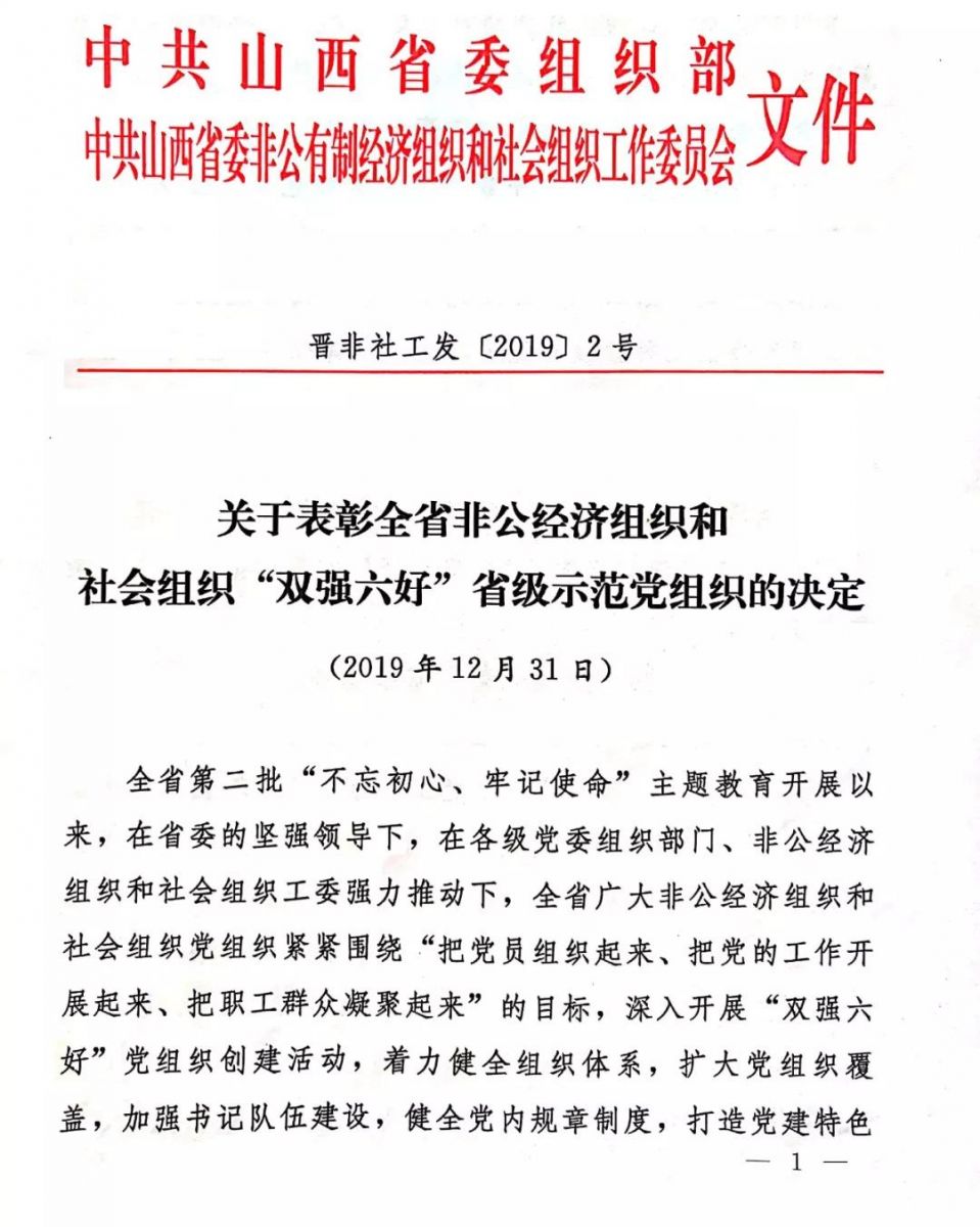 2019年12月31日,公司被省委組織部、省委非公和社會(huì)組織工委授予“雙強(qiáng)六好”省級(jí)示范黨組織榮譽(yù)稱號(hào)。
