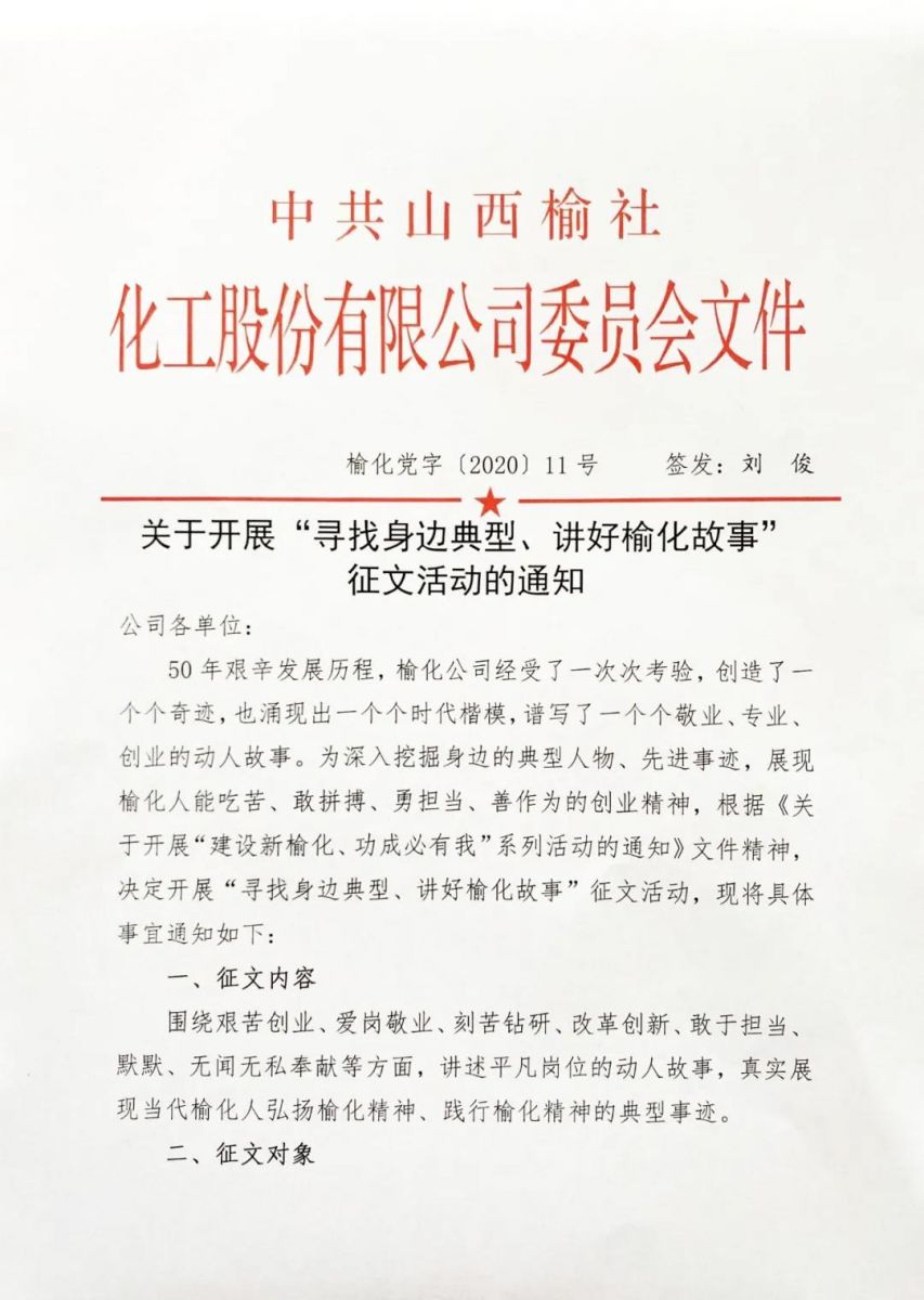 《關(guān)于開展“尋找身邊典型、講好榆化故事”征文活動的通知》