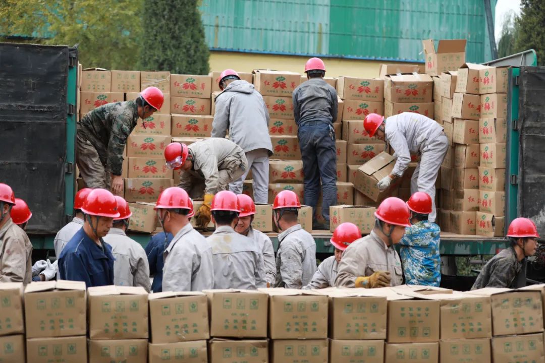 10月20日,伴隨著貨車緩緩駛進榆化,原本寂靜的廠區(qū)一下變得熱鬧起來。貨車一到,工人師傅們立馬擼起袖子拉開車門開始搬卸。利落打開車門,一躍而上,掀開保溫布,有條不紊地把一箱箱祁縣紅薯遞給車下的工友,一排一列,整齊碼垛成座座“小山”。