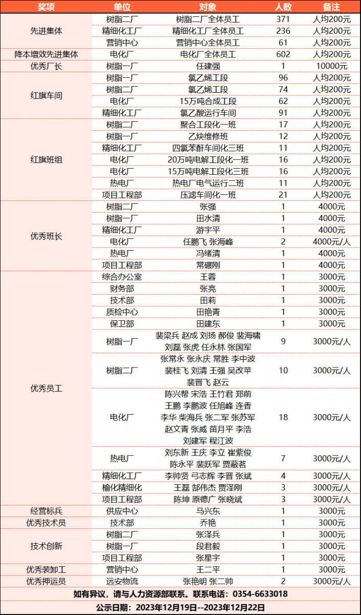 依據(jù)《榆化公司2023年度表彰獎(jiǎng)勵(lì)的通知》要求,結(jié)合各單位推選出的先進(jìn)個(gè)人,2023年度共評選出先進(jìn)集體3個(gè)、降本增效先進(jìn)集體1個(gè)、優(yōu)秀廠長1名、紅旗車間4個(gè)、紅旗班組7個(gè)、優(yōu)秀班長7名、優(yōu)秀員工59名、經(jīng)營標(biāo)兵1名、優(yōu)秀技術(shù)員1名、技術(shù)創(chuàng)新3名、優(yōu)秀裝卸工1名、優(yōu)秀押運(yùn)員2名。