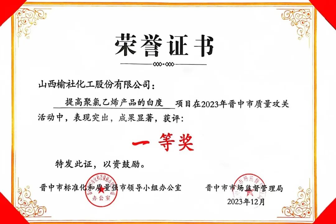 12月28日,在晉中市市場監(jiān)督管理局主辦的2023年晉中市重點質量攻關成果會上,公司“提高聚氯乙烯產品的白度”項目獲得2023年晉中市質量攻關一等獎榮譽。