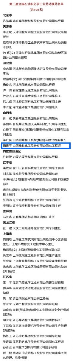 1月15日,第三屆全國(guó)石油和化學(xué)工業(yè)先進(jìn)集體、勞動(dòng)模范和先進(jìn)工作者表彰大會(huì)采用線(xiàn)上線(xiàn)下相結(jié)合的方式在京召開(kāi)。會(huì)上,人力資源和社會(huì)保障部、中國(guó)石油和化學(xué)工業(yè)聯(lián)合會(huì)表彰了81個(gè)單位“全國(guó)石油和化學(xué)工業(yè)先進(jìn)集體”、105名“全國(guó)石油和化學(xué)工業(yè)勞動(dòng)模范”、10名“全國(guó)石油和化學(xué)工業(yè)先進(jìn)工作者”。公司總工程師田建平被授予“全國(guó)石油和化學(xué)工業(yè)勞動(dòng)模范”稱(chēng)號(hào),享受省部級(jí)勞模待遇。