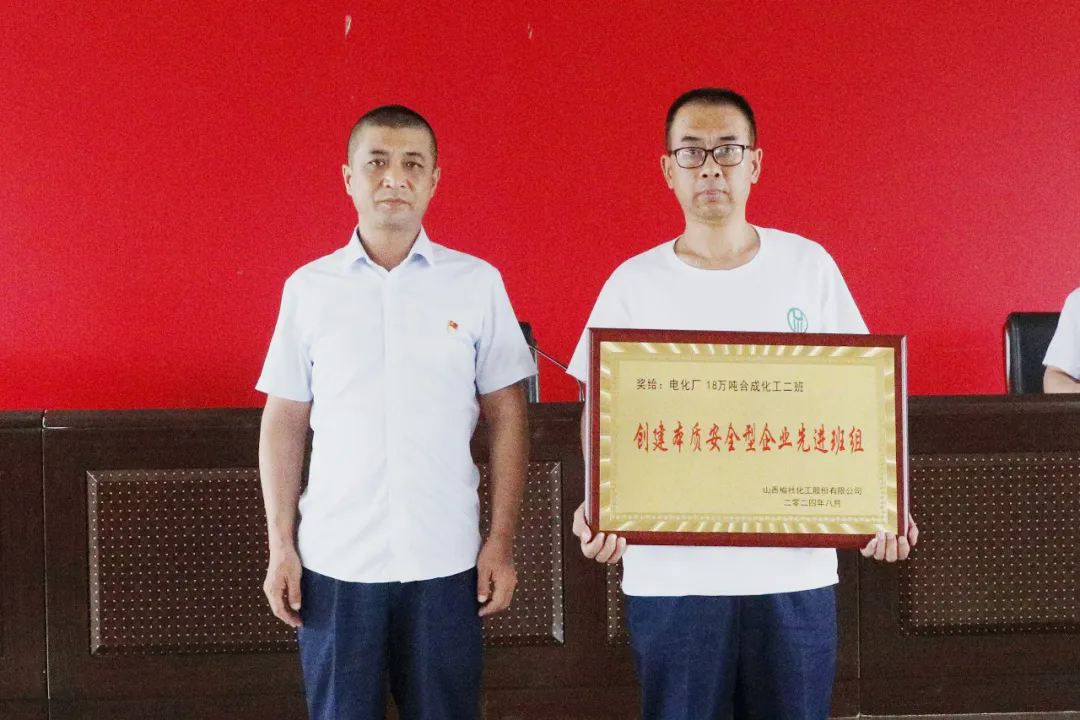會議對在第一階段創(chuàng)建本質(zhì)安全型企業(yè)中取得突出成績的先進班組“電化廠18萬噸合成化工二班”進行了表彰,任開宇為其頒發(fā)榮譽獎牌。班組負責人馬益波進行了經(jīng)驗交流分享。