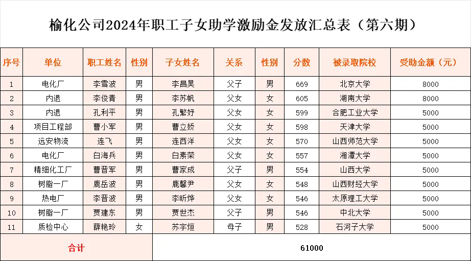 甲辰龍年,榆化子弟高考成績?cè)賱?chuàng)佳績。經(jīng)過前期摸底申報(bào)審核,11名榆化子弟符合受助條件,總計(jì)榮獲助學(xué)激勵(lì)金61000元。其中李昌昊同學(xué)更是以669分的驕人成績奪得榆社縣理科狀元,并被北京大學(xué)錄取,他們是父母的驕傲,也是榆化大家庭的自豪。助學(xué)激勵(lì)金不僅是對(duì)取得優(yōu)異成績的職工子女的激勵(lì),也是對(duì)辛勤培育、默默付出的職工的獎(jiǎng)勵(lì),更是要引導(dǎo)全體職工重視子女教育、重視學(xué)習(xí)知識(shí),激勵(lì)榆化后代勵(lì)志勤學(xué)、刻苦磨煉,努力成為社會(huì)的有用之才、棟梁之材。