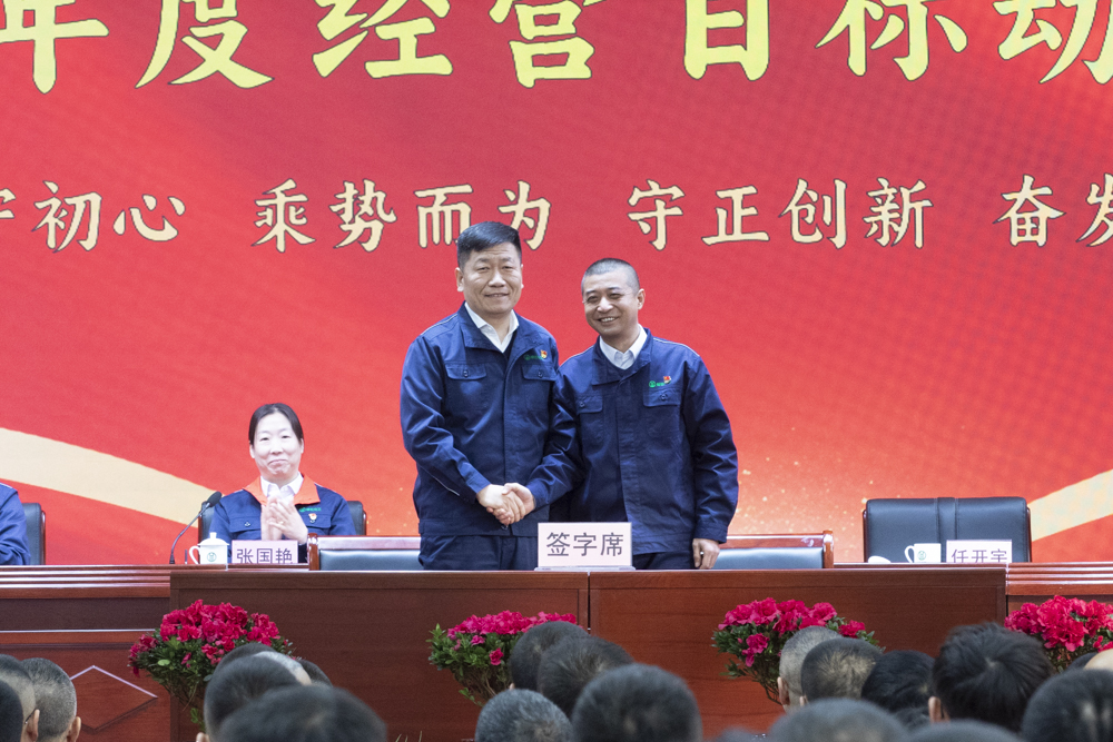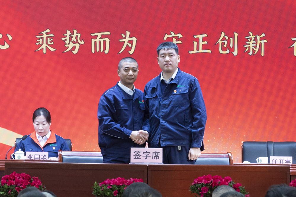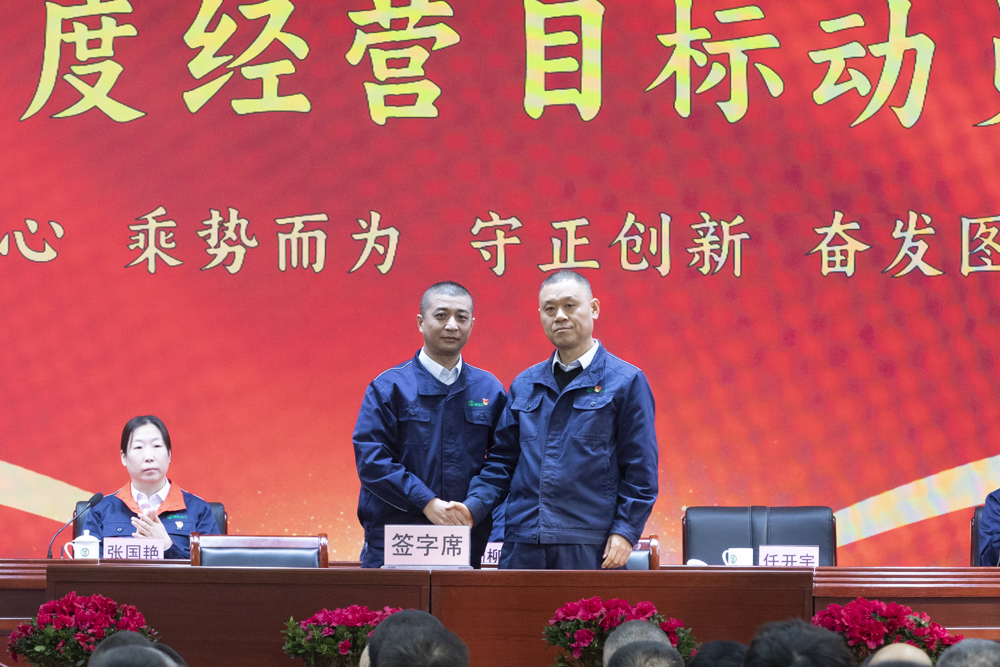 公司黨委書記、董事長楊柳青分別與總經(jīng)理、財務(wù)總監(jiān)、人力資源負(fù)責(zé)人簽訂目標(biāo)責(zé)任書,黨委副書記、總經(jīng)理任開宇分別與總工程師、山西榆化精細(xì)化工有限公司法人代表、榆社縣遠(yuǎn)安物流有限公司負(fù)責(zé)人簽訂目標(biāo)責(zé)任書。