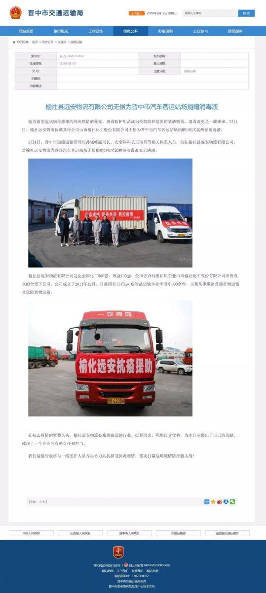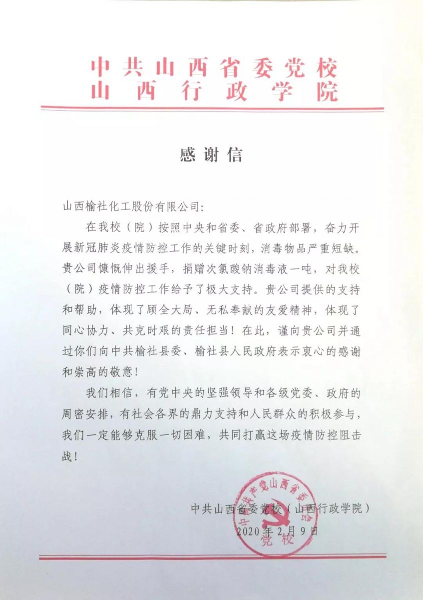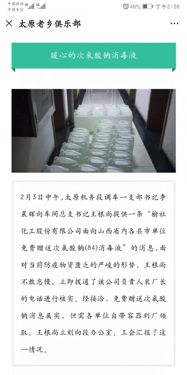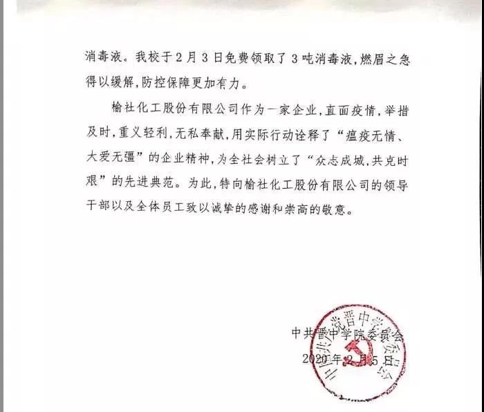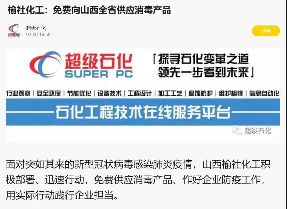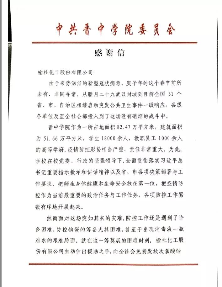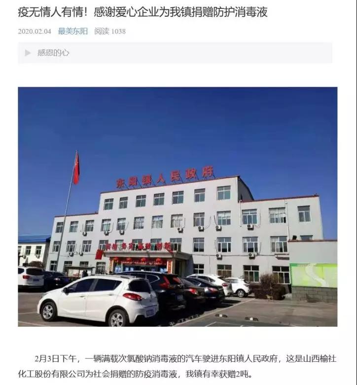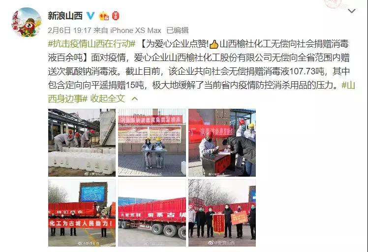 疫情無情,人間有愛。榆化公司于1月31日——2月11日共計為全省范圍內357家單位捐贈次氯酸鈉消毒液163.545噸。社會各界紛紛對榆化所為表示感謝,晉中市衛(wèi)生健康委員會、山西日報、晉中市交通運輸局、晉中市工商聯(lián)合會、新浪山西官媒紛紛發(fā)文對公司做出的義舉表示肯定。