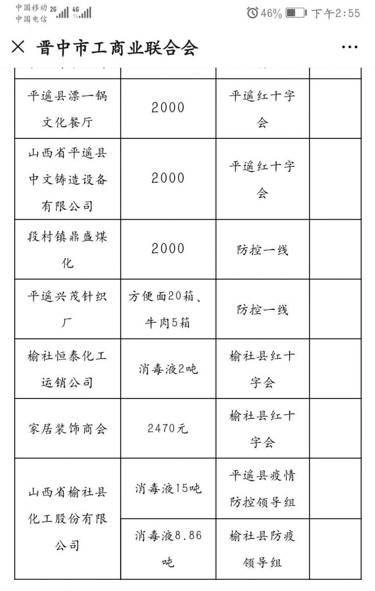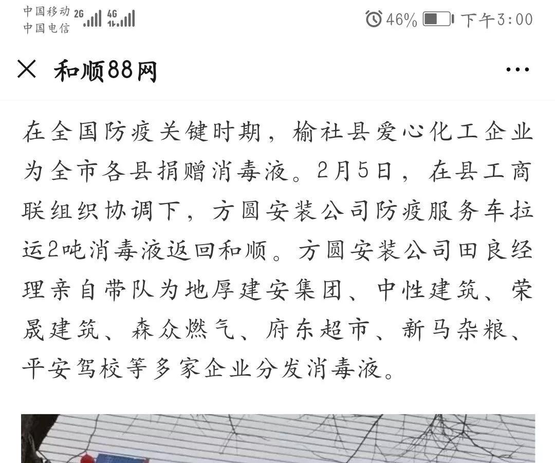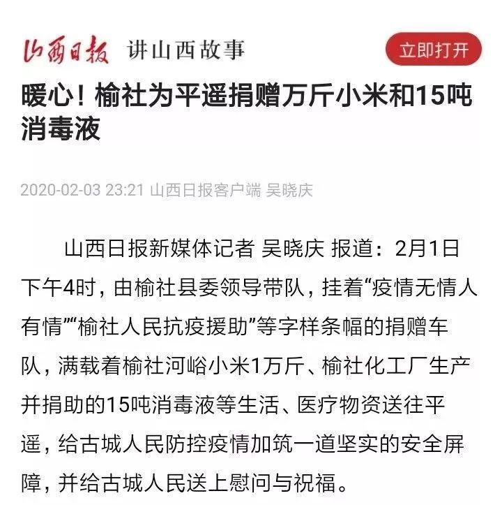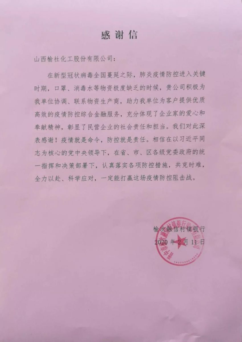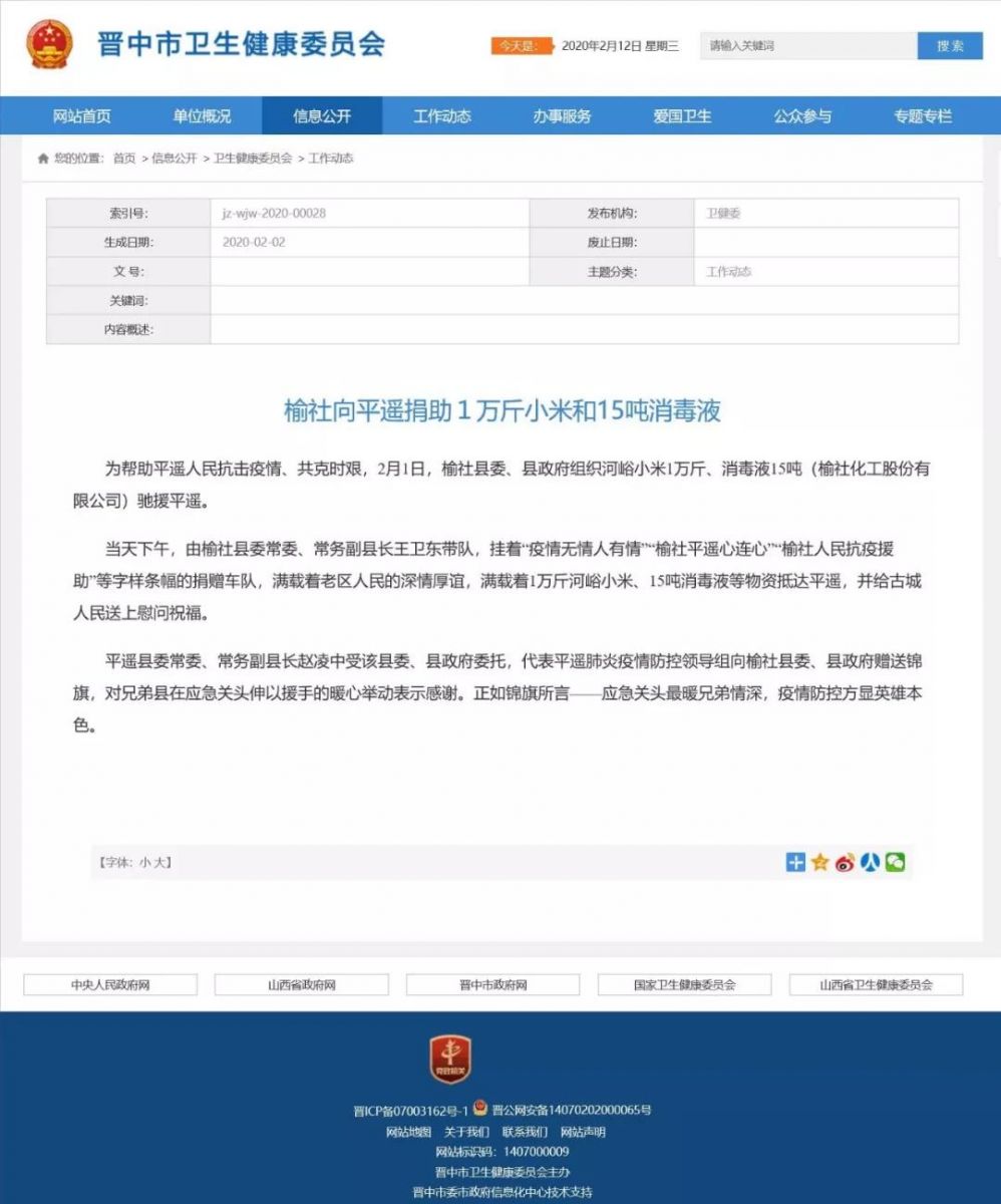 疫情無情,人間有愛。榆化公司于1月31日——2月11日共計為全省范圍內357家單位捐贈次氯酸鈉消毒液163.545噸。社會各界紛紛對榆化所為表示感謝,晉中市衛(wèi)生健康委員會、山西日報、晉中市交通運輸局、晉中市工商聯(lián)合會、新浪山西官媒紛紛發(fā)文對公司做出的義舉表示肯定。