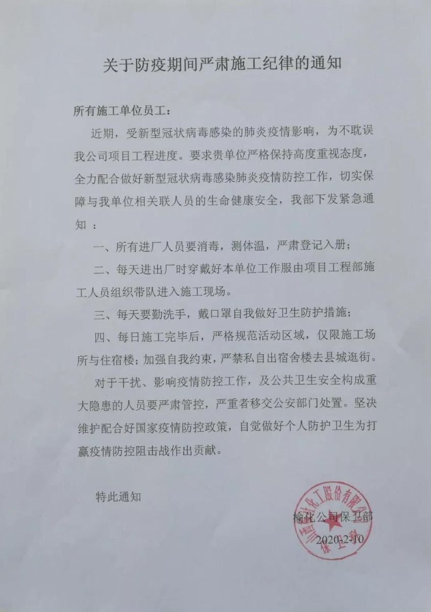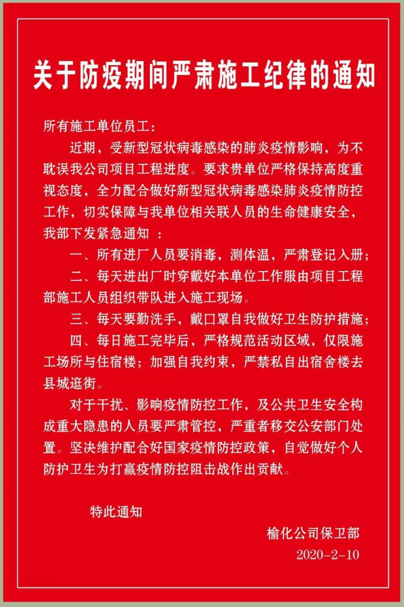 嚴格管控進入廠區(qū)外來施工人員,最大限度減少人員流動;我公司項目建設逐步按計劃推進,給公司防疫工作帶來難度,保衛(wèi)部迅速向施工單位下發(fā)緊急通知,并逐一給施工單位宣講防疫期的工作要求,認真與施工單位負責人簽定安全責任書;同時在施工單位住宿區(qū)大門外設置管理關卡,專人值守,對外來人員實行管制,進出時必須消毒測體溫,登記備案。